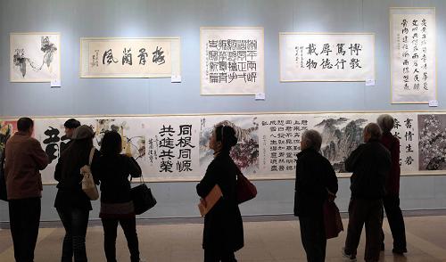 10月28日,觀眾在北京舉行的“海峽兩岸書畫家交流活動作品展”上欣賞書法繪畫作品。 新華社發(羅偉 攝)