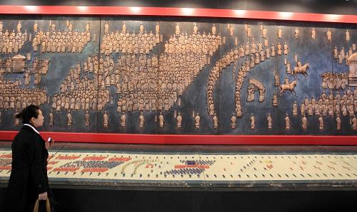 10月28日,觀眾在北京舉行的“海峽兩岸書畫家交流活動作品展”上欣賞巨型銅雕作品《大駕鹵簿圖》。 當日,“和諧中華·海峽兩岸書畫家交流活動作品展”在北京開幕。海峽兩岸近萬件書畫作品中遴選出的近500件精品佳作參展。新華社發(羅偉 攝)