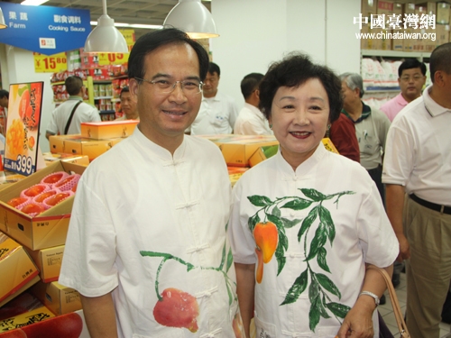 蘇煥智夫婦在愛文芒果前合影。(中國臺灣網 李學斌 攝)