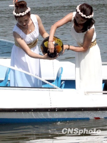 25日下午,由臺(tái)灣南投縣縣長(zhǎng)李朝卿帶來(lái)的一壇日月潭水緩緩注入位于吉林省長(zhǎng)春市的凈月潭內(nèi),兩個(gè)姊妹潭的潭水瞬間融在一起。同時(shí),一艘命名為“日月潭號(hào)”的游船在長(zhǎng)春凈月潭投入使用。