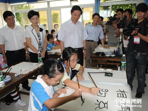 中共四川省委書記劉奇葆欣賞川臺學生共同創作書法作品。圖片來源:四川省臺辦