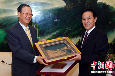 7月28日傍晚,中國最高人民法院副院長、中國法學會審判理論研究會副會長、二級大法官奚曉明先生(右)與海峽兩岸法學交流協會(臺灣)理事長廖正豪(左)先生互換禮物。(張麗君 攝)