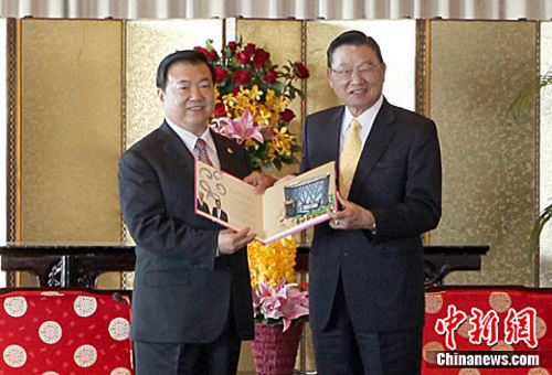 安徽省長(zhǎng)王三運(yùn)率領(lǐng)的“安徽經(jīng)貿(mào)文化寶島行”參訪團(tuán),4月18日午間抵達(dá)臺(tái)北,將展開為期8天的交流活動(dòng)。圖為王三運(yùn)(左)抵臺(tái)后,在臺(tái)北圓山飯店會(huì)見臺(tái)灣海基會(huì)董事長(zhǎng)江丙坤。中新社發(fā) 路梅 攝