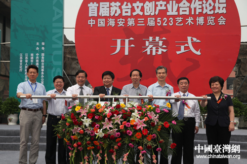 中國臺灣網6月6日南通消息 首屆蘇臺文創產業合作論壇暨中國海安第三屆523藝術博覽會6日上午在江蘇省海安縣隆重開幕,來自海峽兩岸及海內外的近千位嘉賓歡聚一堂,共同探討加強蘇臺文化交流,促進兩岸文創產業合作。國臺辦主任助理龍明彪、信息中心主任仇開明,文化部文化產業司司長劉玉珠,江蘇省臺辦副主任石細云,南通市委書記丁大衛等出席開幕式。