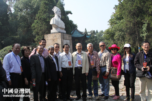 100多位兩岸專家學者與產業界人士,8日來到湖北黃岡祭拜李時珍,圖為祭拜后臺灣嘉賓在醫圣墓前合影。(中國臺灣網 楊麗 攝)