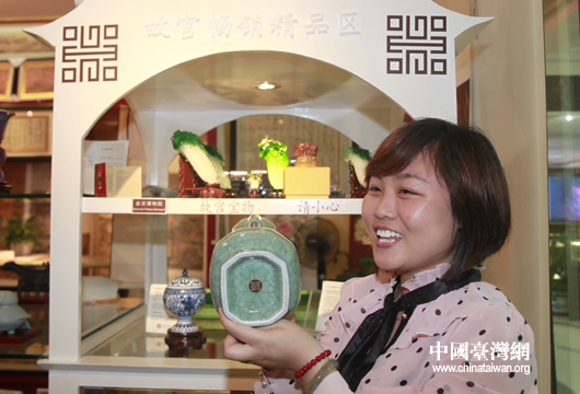 遠(yuǎn)景(故宮)文創(chuàng)生活館店員向記者展示經(jīng)銷的臺北故宮藏品仿品。(中國臺灣網(wǎng) 田云鵬 攝)