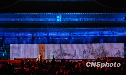 5月15日晚,珍藏在海峽兩岸博物館的《富春山居圖》在北京太廟通過屏幕實(shí)現(xiàn)“合璧”。中央文史研究館館長袁行霈為活動致辭,并與館員歐陽中石、程毅中、沈鵬、傅熹年、侯德昌、舒乙一起為高仿真的《富春山居圖》題跋。 中新社發(fā) 楊慧峰 攝