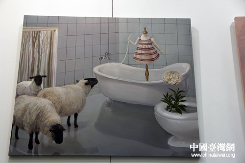 在臺灣藝術(shù)品展區(qū),記者還看到不少表達(dá)人類日趨物質(zhì)化、疏離冷漠的作品,不過也見到有描繪東北平原景象的畫作:1960年代風(fēng)貌的集市中,兩名面容敦厚的姑娘坐在路邊休息,身邊是巨大的菜籃、水壺與蔬果——透露出臺灣藝術(shù)家對大陸一個遙遠(yuǎn)年代的有趣想象。