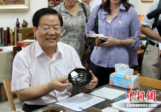 4日,來(lái)到臺(tái)灣中部的中華文化聯(lián)誼會(huì)訪問(wèn)團(tuán)參觀設(shè)立于南投草屯的臺(tái)灣工藝研究發(fā)展中心。蔡武一行用1個(gè)多小時(shí),在研發(fā)中心負(fù)責(zé)人引領(lǐng)下,逐個(gè)工坊、展室進(jìn)行參觀。
