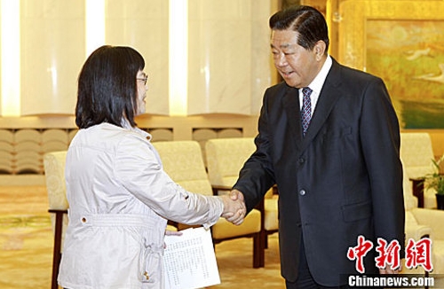 4月15日,中共中央政治局常委、全國(guó)政協(xié)主席賈慶林在北京人民大會(huì)堂會(huì)見了出席“2011海峽兩岸工會(huì)論壇”的臺(tái)灣工會(huì)界主要代表。中新社發(fā) 盛佳鵬 攝