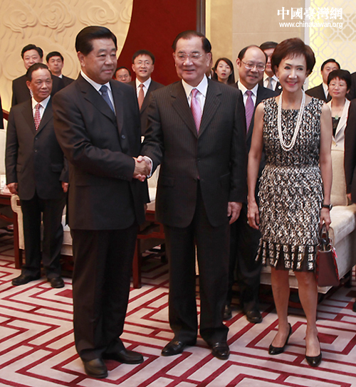 9月18日下午,中共中央政治局常委、全國政協主席賈慶林在南京紫金山莊會見了前來參加2012海峽兩岸企業家紫金山峰會的中國國民黨榮譽主席連戰一行。 (中國臺灣網 田云鵬 攝)