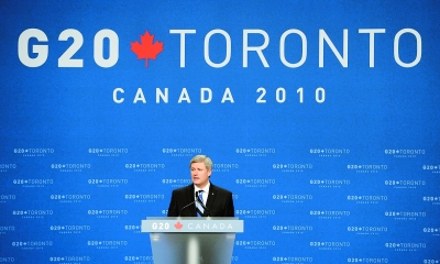 6月27日,在加拿大多倫多會(huì)議中心,加拿大總理哈珀在二十國(guó)集團(tuán)首腦會(huì)議閉幕新聞發(fā)布會(huì)上講話。第四次二十國(guó)集團(tuán)峰會(huì)當(dāng)天在多倫多閉幕,會(huì)議發(fā)表了《二十國(guó)集團(tuán)多倫多峰會(huì)宣言》。 新華社記者 申宏 攝