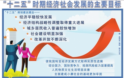 《建議》提出,綜合考慮未來發展趨勢和條件,今后五年經濟社會發展的主要目標是:經濟平穩較快發展,經濟結構戰略性調整取得重大進展,城鄉居民收入普遍較快增加,社會建設明顯加強,改革開放不斷深化。經過全國人民共同努力奮斗,要使我國轉變經濟發展方式取得實質性進展,綜合國力、國際競爭力、抵御風險能力顯著提高,人民物質文化生活明顯改善,全面建成小康社會的基礎更加牢固。