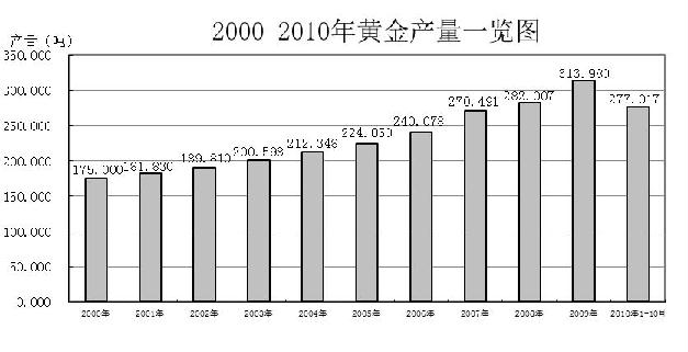 2010年10月,全國產金28.735噸,1-10月累計產金277.017噸。其中黃金礦產金227.508噸,同比增長7.52%,有色副產金49.509噸,同比增長15.26%。