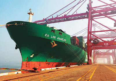 到12月1日,新亞歐大陸橋運營18年過境運輸突破40萬標箱。圖為一艘大型集裝箱船舶?吭谶B云港(江蘇)港口集裝箱碼頭。王健民攝(新華社發)
