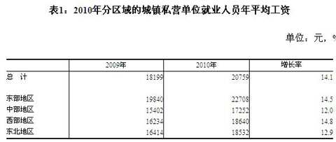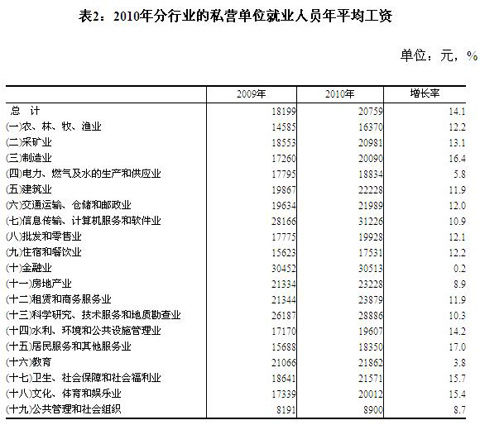 統(tǒng)計局日前公布了2010年城鎮(zhèn)私營單位就業(yè)人員年平均工資統(tǒng)計數(shù)據(jù)。數(shù)據(jù)顯示,2010年全國城鎮(zhèn)私營單位就業(yè)人員年平均工資為20759元,與2009年的18199元相比,增加了2560元,同比增長14.1%,增幅提高7.5個百分點。私營單位就業(yè)人員年平均工資低于城鎮(zhèn)非私營單位在崗職工平均工資,但增長速度高于非私營單位0.6個百分點。