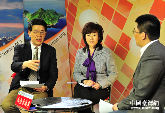 臺灣問題專家中國社會科學院臺灣研究所副所長謝郁(左二)和北京聯合大學臺灣研究院劉紅教授(左一)在接受本網視頻專訪。(中國臺灣網 劉海偉 攝)