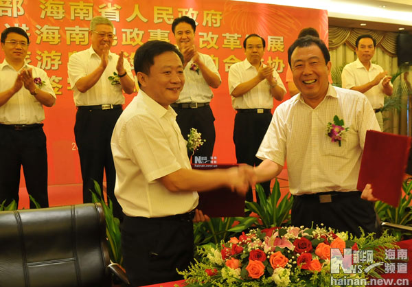 民政部副部長孫紹騁(左)與海南省副省長李國梁在簽約后握手。新華社記者 趙葉蘋 攝
