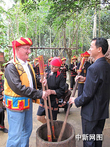 世界旅游業理事會總裁兼首席執行官鮑姆加藤總裁(左)日前在檳榔谷體驗樁米。中新網發 吳艷 攝