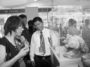 “藝博會”開幕當天,臺灣苗栗縣三義木雕協會的張家琪就與一位上海的客商做成了一筆生意。他特地向觀眾介紹一件兩岸合作的參展作品《一鼓作氣》,他說,作品是臺灣最著名的蟾蜍雕刻師施振木用大陸的老鼓作底座,在上面雕刻一只金蟾蜍,寓意“兩岸和平才是最大的財氣!”(許海生 攝)
