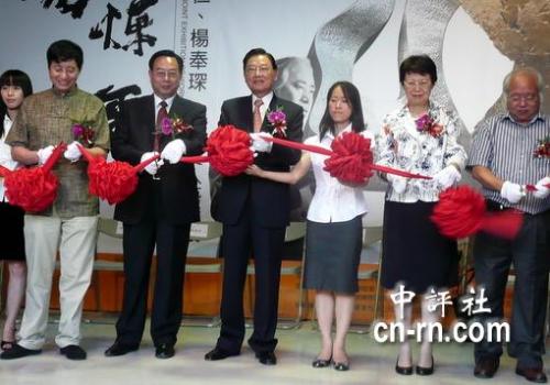 江炳坤(右四)、葉明(左三)及馮明珠(左二)一起為朱炳仁、楊奉琛兩岸雙人藝術展剪彩。(圖片來源:香港中評社 倪鴻祥 攝)