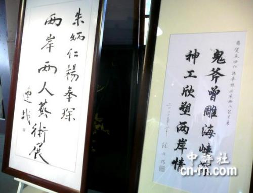 國民黨榮譽主席連戰、海協會長陳云林都為這次兩岸雙人藝術展題詞。(圖片來源:香港中評社 倪鴻祥 攝)