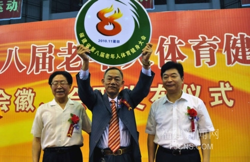 9月2日,福建省第八屆老年人健身大會會徽、會歌發(fā)布儀式在莆田市舉行。當天還舉行了福建省第八屆老年人健身大會會徽傳遞贈送儀式,參加本次大會的臺灣代表團團長黃典本參加了儀式。圖為參加本次大會的臺灣代表團團長黃典本(中)接受會徽傳遞。