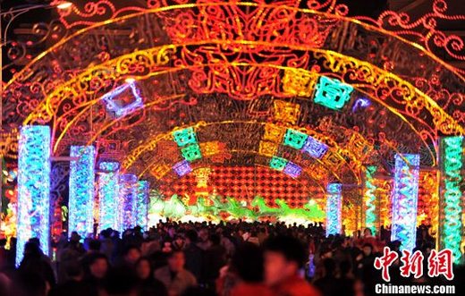 福州馬尾近600萬平方米的兩馬元宵花燈展區(qū)內(nèi)113余組大中小型彩燈、彩門12日晚正式亮燈,以此開啟2011年“兩馬同春鬧元霄”系列活動的序幕。