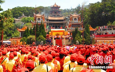 20日,千余名海內外信眾福建湄洲島同祭媽祖。圖為媽祖信眾參加湄洲媽祖祭典儀式祭拜活動,祈求媽祖賜福合境平安的美好祈愿。(高亞成攝)