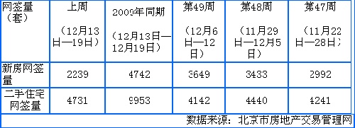 根據北京市房地產交易管理網及偉業我愛我家的統計數據信息顯示:上周(12月13日—19日),全市新建商品房網簽總量為2239套,環比前一周的3649套,大幅下跌38.6%,與去年同期的4742套相比差距達52.8%。全市二手住宅網簽總量為4731套,雖與去年同期相比下跌了52%,但是環比前一周的4142套則上漲了14.2%,日均成交量達675.9套,創4月底北京樓市新政出臺以來的交易量新高。
