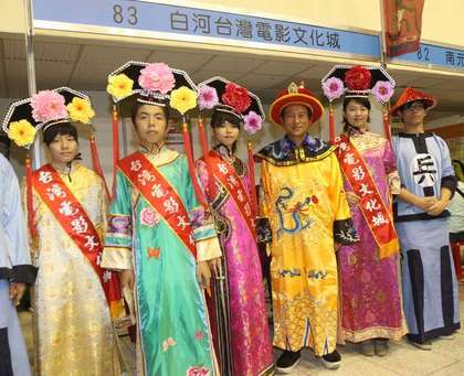 某影視文化城現(xiàn)場(chǎng)錄取的男女人員當(dāng)場(chǎng)穿上格格裝,幫忙招募員工,赫見“男”格格。(來源:臺(tái)灣媒體)