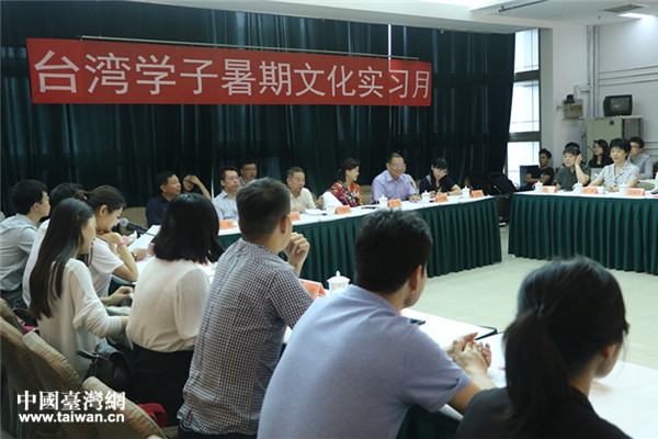 關(guān)宇在座談會上發(fā)言,希望兩岸青年實習生們今后能夠?qū)⒊B?lián)系,延續(xù)友誼,將兩岸文化的交流和心靈溝通延續(xù)下去,共同傳承的和弘揚中華文化。