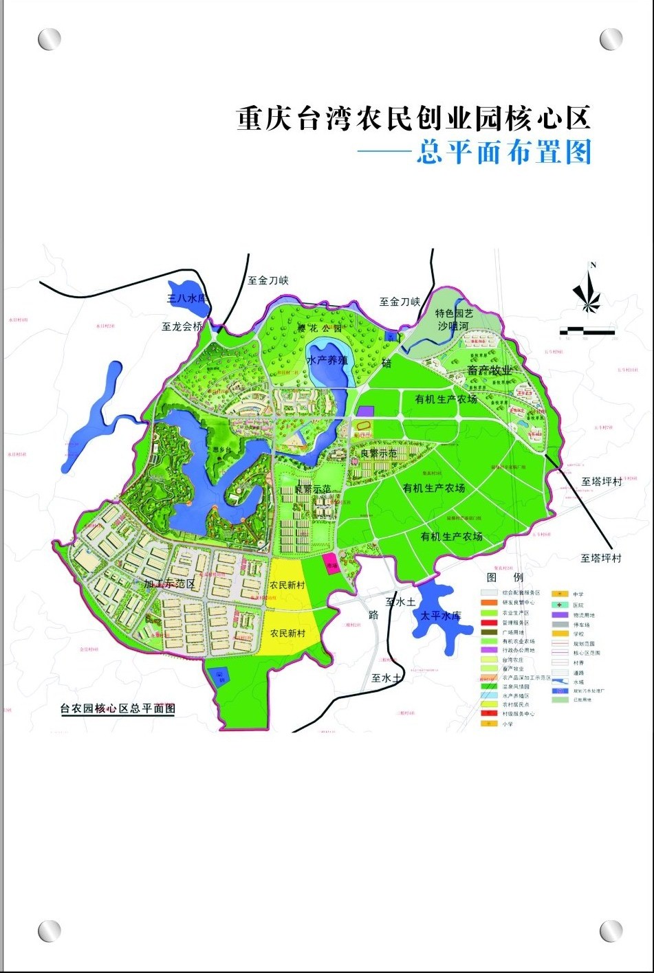 重慶臺灣農民創業園是2006年經國家農業部、國臺辦批準設立的首批四家臺創園之一。選址于具有500年花卉種植歷史的“中國花木之鄉”——北碚區靜觀鎮,位于重慶主城北部,毗鄰兩江新區,距重慶解放碑59公里、江北國際機場32公里、北碚城區21公里。園區產業規劃面積14平方公里,其中,核心區4平方公里(包括1平方公里的城市建設用地),拓展區10平方公里,輻射區200平方公里,分為六個功能區,即瓜果蔬菜示范區、花卉苗木展示區、研發良繁示范區、風情觀光及管理服務區、農產品加工示范區、集中居住示范區。園區堅持“以臺為主、以農為主”的發展定位,重點引進現代特色休閑農業、農業高科技成果,打造以特色園藝和花卉苗木展覽展示、觀賞體驗為主的現代農業旅游景區,形成集旅游觀光、研發繁育、種植示范為一體的都市城郊型現代農業示范園。