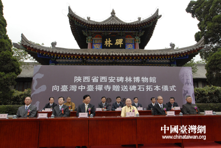 中國臺灣網5月6日西安消息 5月5日,陜西省舉行“西安碑林博物館向臺灣中臺禪寺贈送碑石拓本儀式”。陜西省副省長景俊海、國臺辦交流局局長李維一、西安碑林博物館館長趙力光和臺灣中臺禪寺惟覺長老、中臺禪寺護法總會會長李祖原等出席贈送儀式并發表了熱情洋溢的致辭。