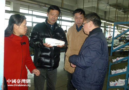 陳推一行在臺企寶峰鞋業(yè)公司視察。(圖片來源:黃石臺辦)