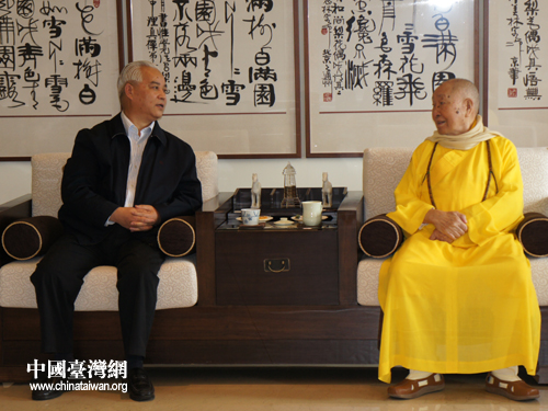 四川省政協(xié)主席陶武先與中臺禪寺開山方丈惟覺法師親切交談。(圖片來源:四川省臺辦)