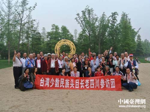 臺灣少數民族頭目長老四川參訪團在成都金沙遺址博物館參觀合影。(圖片來源:四川省臺聯)