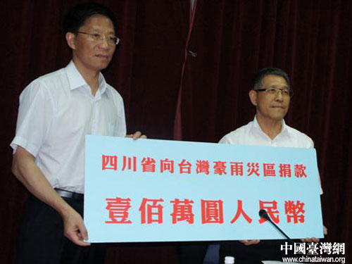 中國臺灣網(wǎng)6月24日臺中消息 6月22日,受中共四川省委書記劉奇葆、省長蔣巨峰委托,正率四川農(nóng)業(yè)交流團(tuán)在臺灣參訪的中共四川省委常委、副省長鐘勉來到位于臺中市的臺灣省農(nóng)會,代表中共四川省委、四川省人民政府和9000萬四川人民向臺灣豪雨災(zāi)區(qū)捐款100萬元人民幣,用于近期遭遇豪雨和臺風(fēng)襲擊,遭受重大損失的農(nóng)村和農(nóng)戶賑災(zāi),委托臺灣省農(nóng)會具體實(shí)施。