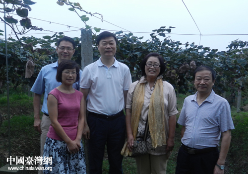 臺(tái)商金憶君(右2)與德陽市長(zhǎng)陳新有(右3)考察后在獼猴桃種植基地合影。(圖片來源:綿竹市臺(tái)辦)