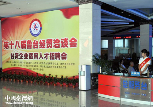 中國臺灣網9月14日濰坊消息 日前,濰坊人力資源市場新華路市場在大紅拱門、氣球條幅舞動的熱烈場面襯托下,招聘大廳人頭攢動,熱鬧非凡。“第十八屆魯臺經貿洽談會臺資企業適用人才招聘會”在這里隆重舉辦。能容納百余家企業的招聘現場,105家企業入會參加招聘活動,吸引了數千位應屆大學畢業生、各類技工、勞務人員到現場應聘。此次招聘會由山東省人力資源和社會保障廳、山東省政府臺灣事務辦公室和濰坊市政府聯合主辦,濰坊市人力資源和社會保障局和市臺辦承辦。活動歷時一天,取得圓滿效果。