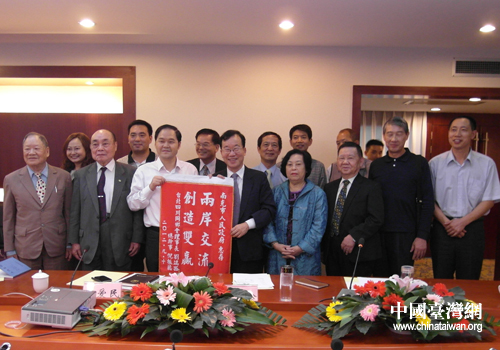座談會上,臺北市四川同鄉(xiāng)會贈送了“兩岸交流,創(chuàng)造雙贏”錦旗。(中國臺灣網(wǎng)南充市臺辦通訊員 張國友 秦榕聆)