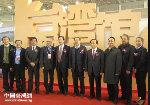 威海市領(lǐng)導(dǎo)和臺(tái)灣嘉賓在威海文博會(huì)臺(tái)灣館前合影(威海市臺(tái)辦 孫姍姍 攝)