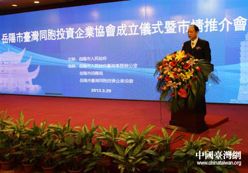 中國臺灣網4月3日岳陽消息 日前,由岳陽市人民政府主辦,市臺辦、市招商局、市臺協共同承辦的岳陽市臺灣同胞投資企業協會成立儀式暨市情推介會在煙波浩淼的洞庭湖畔,氣勢雄偉的岳陽樓下,風景秀美的南湖之濱隆重舉行。臺灣;鶗麻L林中森一行,全國臺企聯總會長郭山輝、常務副會長兼秘書長何世忠,國臺辦綜合局副局長、海協會副秘書長鄭崇陽,省臺辦主任馮波,各地臺協會長和重要臺商聚集岳陽。