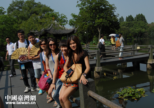 杭州西湖邊,營員們合影留念。(圖片來源:上海市臺聯)