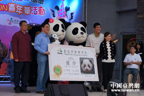 慶典現(xiàn)場(chǎng),圓仔命名活動(dòng)票數(shù)揭曉,“圓仔”這個(gè)名字得票最高,臺(tái)北市市長(zhǎng)郝龍斌公布大陸贈(zèng)臺(tái)大熊貓寶寶命名為“圓仔”,并為“圓仔”頒發(fā)榮譽(yù)市民證,邀請(qǐng)“圓仔”擔(dān)任臺(tái)北市保育大使。威海市政府及臺(tái)灣梅花鹿、長(zhǎng)髯山羊棲居地威海劉公島森林公園,也為“圓仔”送上了祝福和問候。(中國(guó)臺(tái)灣網(wǎng)、威海市臺(tái)辦聯(lián)合報(bào)道)