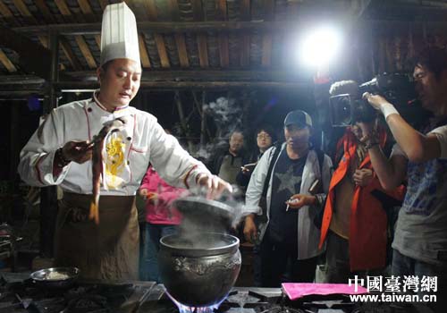 臺灣中時媒體集團(tuán)采訪組一行采訪拍攝著名的“雅魚”現(xiàn)場烹制。(圖片來源:四川省臺辦)