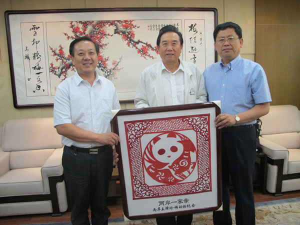 威海臺辦主任于連波向前任海協(xié)會(huì)長陳云林贈(zèng)送“兩岸一家親”刺繡標(biāo)識。左一為于連波主任、中為前海協(xié)會(huì)陳云林會(huì)長、右一為時(shí)任威海劉公島管委會(huì)主任袁學(xué)恩(高江濤 攝)