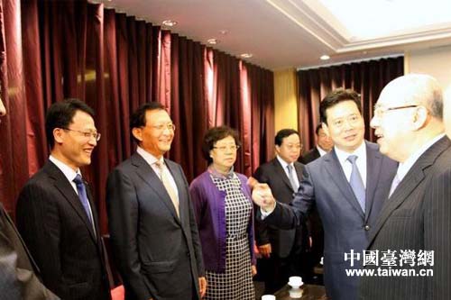 青島市委李群書記在臺北向吳伯雄榮譽主席介紹青島團中的企業家。(圖片來源:山東省臺辦)