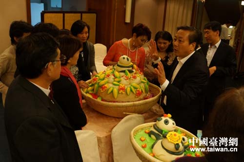 10月下旬,威海市委副書記、市長張惠率威海市經濟文化考察團赴臺參加“2013臺灣·山東周暨第十九屆魯臺經貿洽談會”,并舉辦了“走親戚、看歡喜、賀慶典”活動,出席臺北市立動物園建園99周年慶典暨臺灣贈送大陸梅花鹿、長鬃山羊祝!皥A仔”健康成長活動。為慶賀大熊貓“圓仔”出生而制作的入選山東省非物質文化遺產的威海大餑餑(用66公斤面粉制作的一組大餑餑)和柳編工藝品,一經出現在慶典上就引起了2萬多游園群眾的關注。