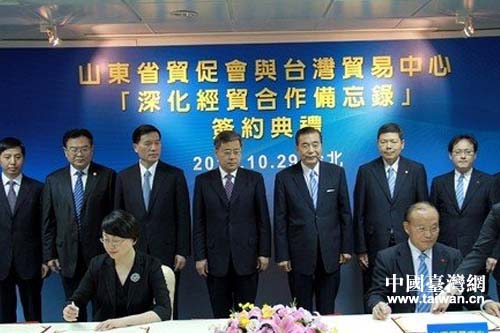 山東省委副書記、省長郭樹清等在臺北出席山東省貿促會與臺灣貿易中心“深化經貿合作備忘錄”簽約儀式。(圖片來源:山東省臺辦)